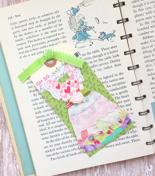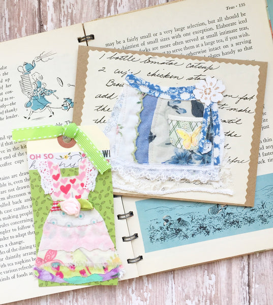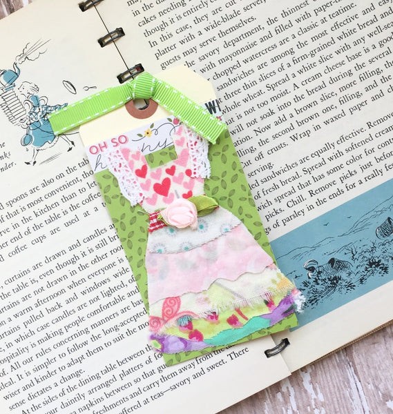 This cute little apron tag is made using a manila tag that is five and a quarter inches long by two and a half inches wide. Each one is fixed with layers of decorative paper and fabric scraps, and various ephemera. Topping it off is a green bow. It looks great tied to a gift for that special person. A decorative piece of cotton twine is included for attaching to a gift.