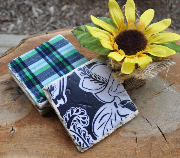 These coasters are not only beautiful but functional.  They are made with four inch square, rough cut tumbled stone tiles.  Each one is fixed with decorative fabric scraps, and then sealed with a protective poly acrylic coating.  The bottom is lined with cork, making it perfect for indoor and outdoor use.  A set consists of four tiles.