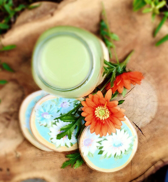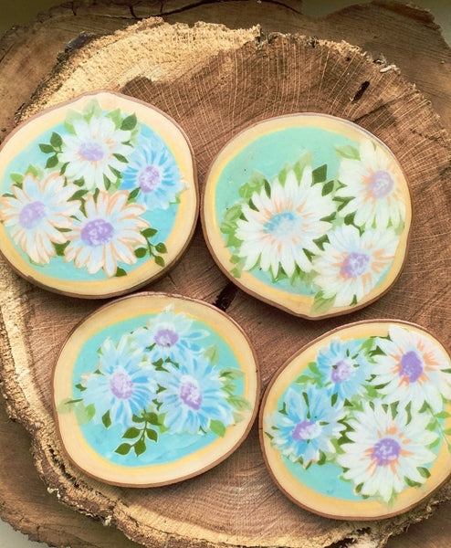 These coasters are not only beautiful but functional.  They are made with five inch round wood slices, approximately half an inch thick.  Each one is fixed with decorative fabric scraps, and then sealed with a protective poly acrylic coating.  They are perfect for indoor and outdoor use.  A set consists of four wood slices.