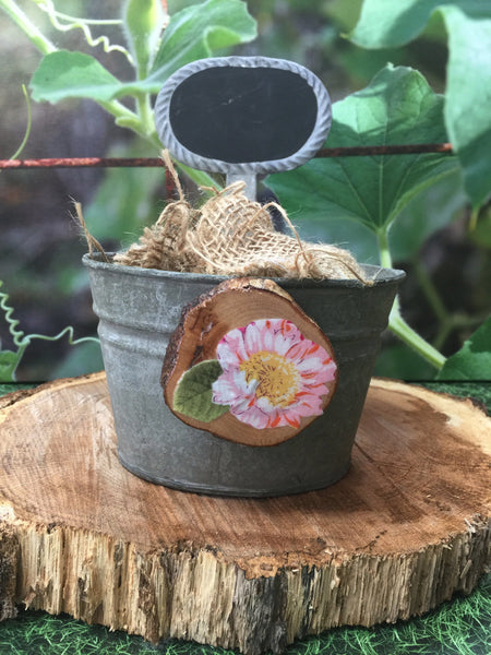 This magnet is made using a two inch round wood slice.  Each one is fixed with decorative fabric scraps and then sealed with a protective poly acrylic coating.  A magnet is attached to the back.  Looks great holding up those "to do" lists on the refrigerator.