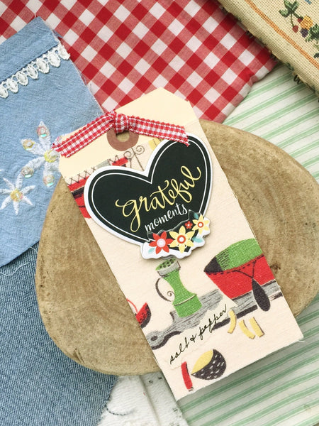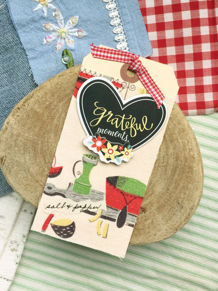 We all have so much to be thankful for. This cute little tag is made using a manila tag that is five and a quarter inches long by two and a half inches wide. Each one is fixed with layers of decorative fabric scraps, and various ephemera. Topping it off is a red and white gingham bow. It looks great tied to a gift for that special person. A decorative piece of cotton twine is included for attaching to a gift.