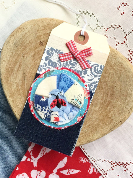 This cute little ladybug tag is made using a manila tag that is four and three quarter inches long by two and a half inches wide. Each one is fixed with layers of decorative paper and fabric scraps, and various ephemera. It looks great tied to a gift for that special person. Topping it off is a tiny red and white gingham bow. A decorative piece of cotton twine is included for attaching to a gift.