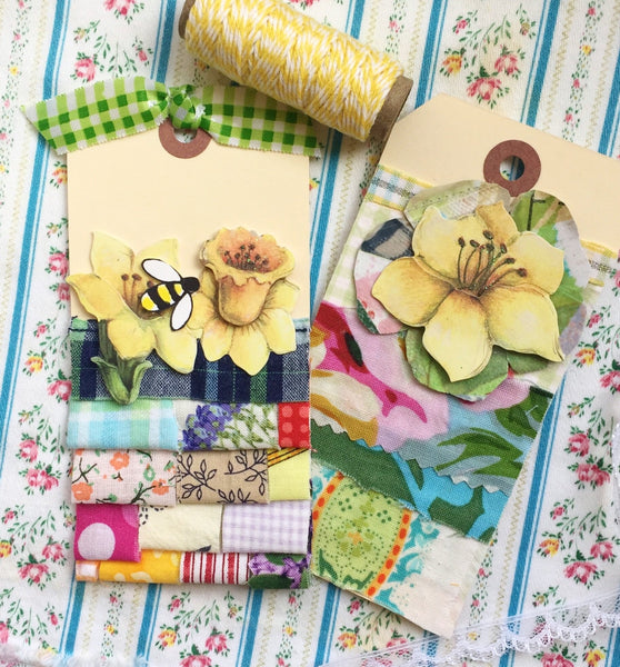 This cute little honeybee tag is made using a manila tag that is five and a quarter inches long by two and a half inches wide. Each one is fixed with layers of decorative paper and fabric scraps, and various ephemera. Topping it off is a green gingham bow. It looks great tied to a gift for that special person. A decorative piece of cotton twine is included for attaching to a gift.