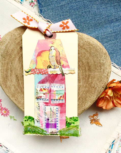 Great for attaching to a housewarming gift, this tag is made using a manila tag that is five and a quarter inches long by two and a half inches wide. Each one is fixed with layers of decorative paper and fabric scraps, colored pencils, and various ephemera. Topping it off is a cute orange flower bow. A decorative piece of cotton twine is included for attaching to a gift.
